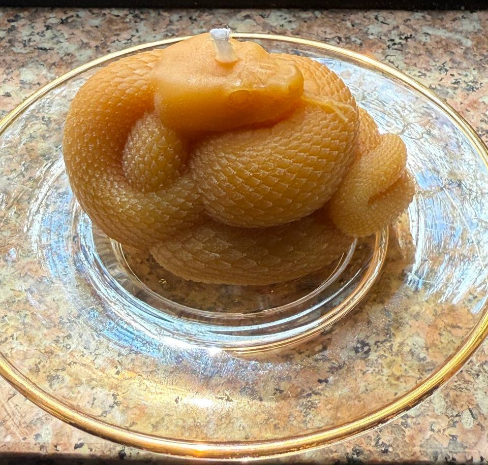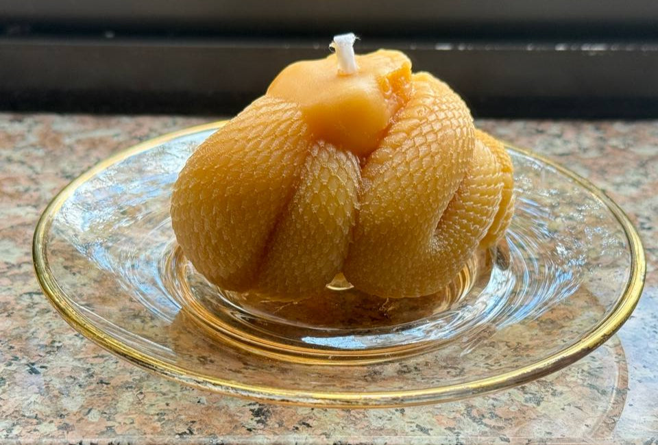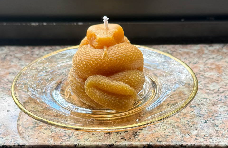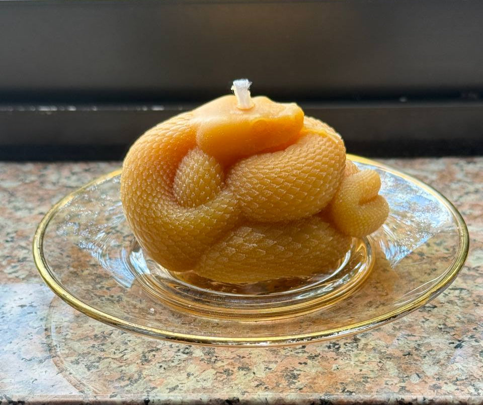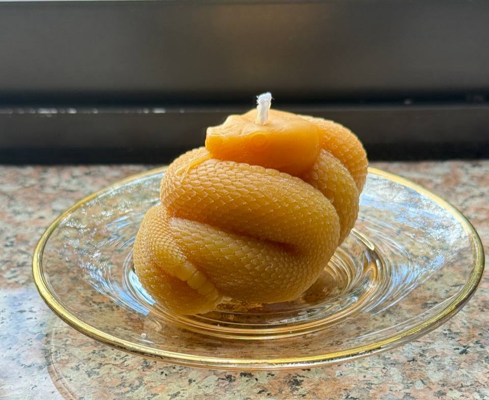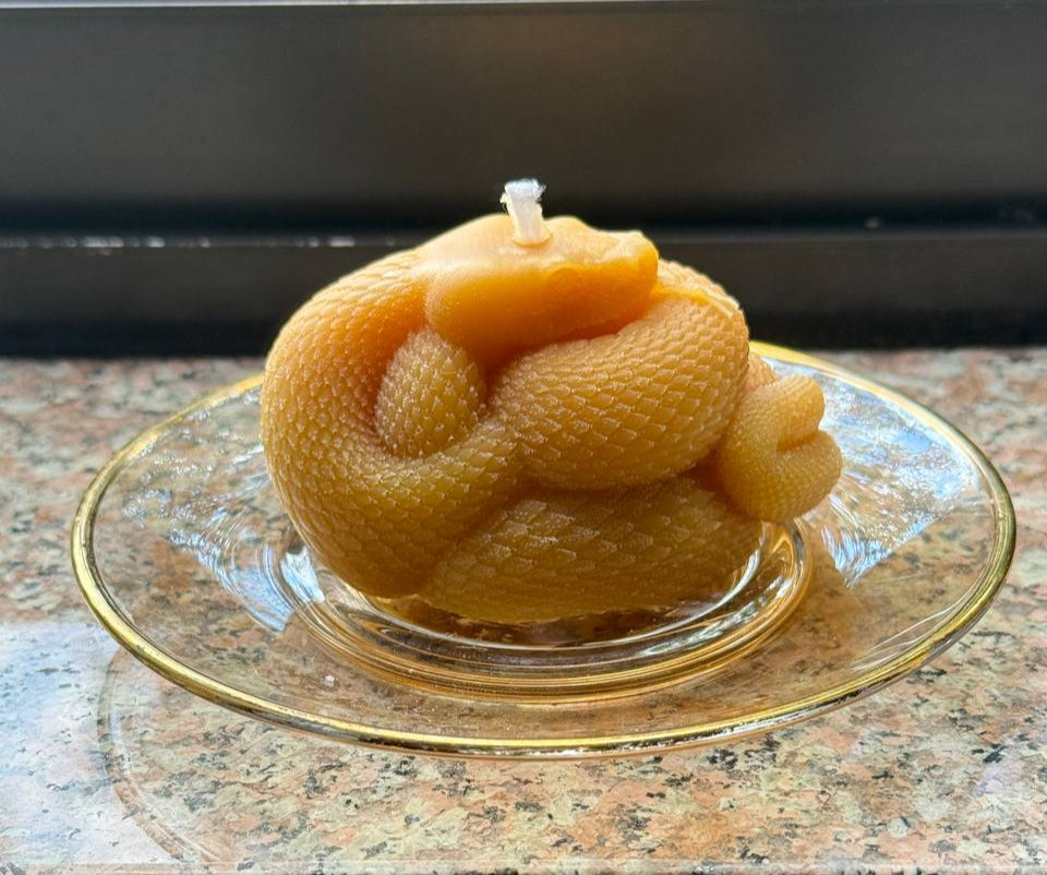 Embrace the mystique of the "Serpentine Rose Gold Coil," a handcrafted organic beeswax candle sculpted into a striking coiled snake design, radiating a luxurious rose gold hue. Set against a scenic backdrop, this candle weaves artistry and nature, casting a warm, captivating glow ideal for gifting or elevating your decor. Measuring approximately 4 inches long, 2 inches wide, and 3 inches high, its intricate form embodies a harmonious blend of rustic charm and modern allure. With 2025 marking the Year of the Snake in the Chinese zodiac, this candle’s serpentine shape celebrates renewal and wisdom, perfectly aligning with the year’s symbolic energy.